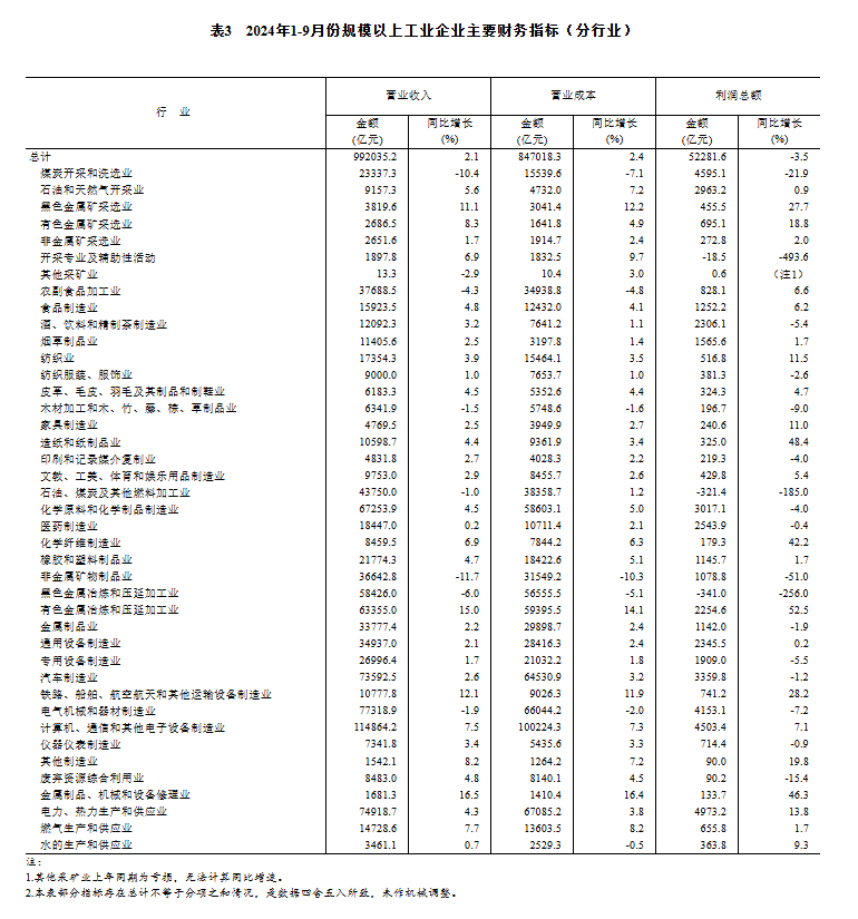 1—9月份,主要行業利潤情況如下:有色金屬冶煉和壓延加工業利潤同比增長52.5%,電力、熱力生產和供應業增長13.8%,紡織業增長11.5%,計算機、通信和其他電子設備制造業增長7.1%,農副食品加工業增長6.6%,石油和天然氣開采業增長0.9%,通用設備制造業增長0.2%,汽車制造業下降1.2%,化學原料和化學制品制造業下降4.0%,專用設備制造業下降5.5%,電氣機械和器材制造業下降7.2%,煤炭開采和洗選業下降21.9%,非金屬礦物制品業下降51.0%,石油煤炭及其他燃料加工業、黑色金屬冶煉和壓延加工業同比由盈轉虧。